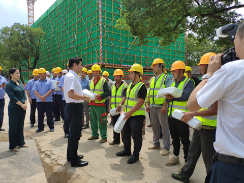 8月21日上午十一点,接近中午烈日炎炎,湘江集团党委书记、董事长张利刚一行来到半岛平台承建的长沙科技创意园项目,现场看望慰问高温天气下依然坚守战斗在岗位上的广大建设者,为大家送来了冰箱、电风扇、凉茶、藿香正气水、夏桑菊、西瓜等防暑降温用品。